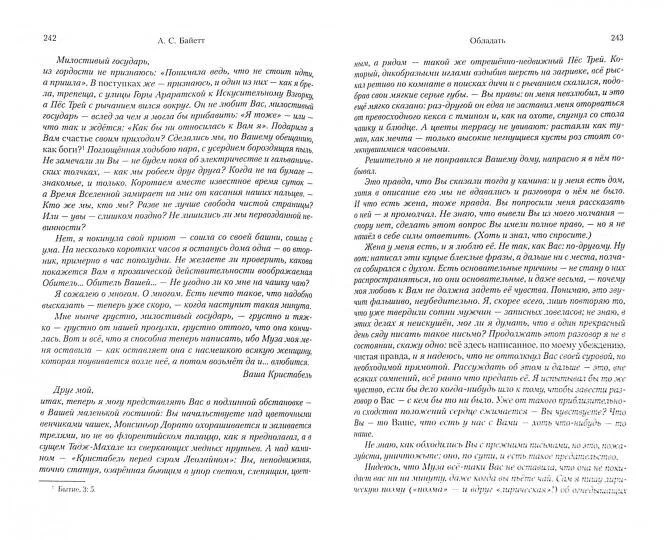 «Обладать» — один из лучших английских романов конца XX века и, не сомненно, лучшее произведение Антонии Байетт. Впрочем, слово «роман» можно применить к этой удивительной прозе весьма условно. Что же такое перед нами? Детективный роман идей? Женский готический роман в современном исполнении? Рыцарский роман на новый лад? Все вместе — и нечто большее, глубоко современная вещь, вобравшая многие традиции и одновременно отмеченная печатью подлинного вдохновения и новаторства. В ней разными гранями переливается тайна английского духа и английского величия. Но прежде всего, эта книга о живых людях (пускай некоторые из них давно умерли), образы которых наваждением сходят к читателю; о любви, мятежной и неистовой страсти, побеждающей время и смерть; об устремлениях духа и плоти, земных и возвышенных, явных и потаенных; и о божественном Плане, который проглядывает в трагических и комических узорах судьбы человеческой... По зеркальному лабиринту сюжета персонажи этого причудливого повествования пробираются в таинственное прошлое: обитатели эпохи людей — в эпоху героев, а обитатели эпохи героев — в эпоху богов. Две стихии царят на этих страницах — стихия ума, блеска мысли, почти чувственного, и стихия тонкого эротизма, рождающегося от соприкосновения грубой материи жизни с нежными тканями фантазии. «Обладать» занимает уникальное место в истории современной литературы и, при своем глубоком национальном своеобразии, принадлежит всему миру. Теперь, четверть века спустя после выхода шедевра Байетт, кажется мало Букеровской премии, присужденной в 1990 году. Как, может быть, мало и ордена Британской империи, врученного автору чуть позднее... Академическая дама, специалист по английской филологии, сдержанная феминистка, страстная охотница до чтения, «королева и святая покровительница всех книжных червей», Антония Байетт опубликовала в 1990-м роман «Обладать». Тот свиньей вклинился в и без того неслабую букеровскую шестерку и забрал премию так, что никто не пикнул; сразу сделался бестселлером по обеим сторонам Атлантики. Это прямо-таки роман-роман: при формировании хоть сколько-нибудь представительной библиотеки всемирной литературы он должен присутствовать там безоговорочно. «Обладать» — серия страстных вторжений в частную собственность, во всех смыслах. Из одних складывается почти детективная линия (ближе к концу роман местами смахивает даже и на триллер); из других — чувства, собственно «романтический роман», поэма о рыцаре и его возлюбленной. Роман весь состоит из композиционных и сюжетных фокусов; чуть ли не все детали и эпизоды здесь разыгрываются по несколько раз, на разных сюжетных уровнях; разгадывать эти загадки — счастье читателя. Разумеется, «Обладать» — обязательное чтение для всех людей, имеющих хоть какое-то отношение к английской филологии. Совсем не разумеется, но это так — отдельных аплодисментов заслужили переводчики. Лев Данилкин (Афиша) Антония Байетт английская достопримечательность, как Тэтчер, Тауэр и файв о`клок. Центральным из ее романов считается как раз этот, принесший леди Антонии Букеровскую премию и в конечном счете орден Британской империи. И это справедливо: мало кому и мало где удавалось соорудить захватывающий детектив из филологических штудий, мало кто умеет так замаскировать под детектив любо