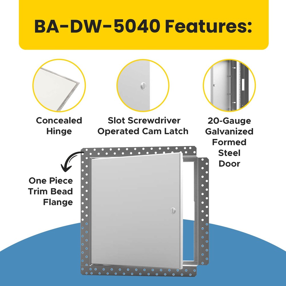 access panel, access panel for drywall, drywall access panel, door panel, electrical panel cover, electric panel cover, wall access panel for drywall, wall access panel, plumbing access panel for drywall, plastic wall panel, attic access door, plumbing access panel, drywall access panels, access door, floor panels, ceiling access panel, access doors for drywall, ceiling access panel for drywall, plastic access panel, plastic access panel for drywall, ceiling access panels, access panels, 12x12 access panel for drywall, access panel 12 x 12, metal access panel, metal access door, crawlspace door, drywall panel, 16x16 access panel, 12x12 access panel, drywall access panels 12 x 12, access panel 8x8, crawl space access door, access panel 24 x 24, access panel 6x6, spring loaded access panel, drywall access door, access panel 16x16, spring access panel, plumbing access panels for drywall, attic access panel, wall access panels, 10x10 access panel, 6x6 access panel, 8x8 access panel, 12 x 12 access panel, 24x24 access panel, 18x18 access panel, 24x24 access panel for drywall, 14x14 access panel for drywall, small access panel, drywall access cover, shower access panel, drywall door access panel, tile access panel, hidden drywall access panel, metal access panel for drywall, access panel for drywall 16x16, drywall panels, drywall access panel 6x6, drywall access covers, access panel 14x14, spring loaded access panel 12x12, drywall access panels 14 x14, access panel door, 4x4 access panel, access panel 18x18, 14 x 14 access panel, 18x18 access panel for drywall, large access panel, insulated access panel, access panel 10x10, round access panel, access door panel for drywall, 12x24 access panel, access panels for drywall, drywall access panel 8x8, access drywall panel, 10x12 access panel, plumbing wall cover, large access panel for drywall, drywall access panel 16x16, 20x20 access panel, access wall panels, access covers for drywall, dry wall access panels, drywall cover plate, access panel door with frame, drywall cover panel, wall access panels for drywall, 16x16 access panel for drywall, 8x8 access panel for drywall, 24 x 24 access panel, 6x6 access panel for drywall, 10x10 access panel for drywall, metal door, steel door, access door for drywall, stainless steel access door, stainless steel access doors, attic access door insulation, access door for drywall 48, access panel for drywall 12 x 24, 12 12 access panel, rated access panel, wall and ceiling access panel, access panel for drywall 12 x 12, ceiling access panel 24x24, 16x24 access panel, drywall plumbing access panel, drywall acess panel, access door 12x12, access door for drywall 12 x 12, fire rated access doors 24x24, insulated access door ✅ High-Quality Construction: The BA-DW-5040 universal access panel is engineered for longevity, featuring a robust 20-gauge steel door and a 26-gauge door frame with multiple bends for added structural strength. Made in North America, this access door with bead flange includes a concealed hinge for a clean finish and is built to withstand extensive use without compromising performance. ✅ Ideal for Drywall: Our flush access panel for drywall and ceilings, with a screwdriver-operated cam latch, provides easy, secure access to critical areas behind the drywall for a wide range of commercial, industrial, institutional, and residential applications. ✅ Easy Installation: BA-DW-5040 22” x 22” drywall access panel with exposed bead flange & integral perforated taping bead intelligent design adds rigidity and allows for tape and jointing on-site. It is suitable for non-fire rated drywall and ceilings. ✅ Seamless Finish: This metal access panel with a high-quality 5-stage iron phosphate preparation white baked-on polyester powder coat finish on door panel and mill finish on frame, is suitable for any room in the house or building due to its elegant appearance and versatility. The access door seamlessly blends with the drywall once compound is applied.
