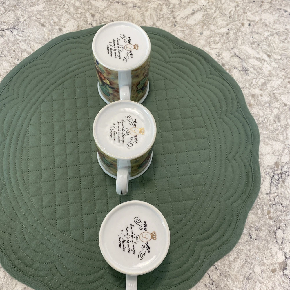 Email De Limoges France Fruit Design Mugs 3 1/2" Cups Coffee Tea Set of 3. NEAR MINT CONDITION! Very nice cups. Shipped w/ USPS Parcel Select Ground. ** Near Mint Pre-Owned Condition** (No cracks, chips, nicks, or crazing) Fast Shipping!! Smoke Free Home ~SHOP WITH CONFIDENCE~100% POSITIVE FEEDBACK!~ All sellers desire positive feedback—it keeps us in business—if for any reason you feel you cannot leave positive feedback please contact me—I am very proud of my seller rating! *** ~Payment Information~ I accept PayPal only; payment is due within 48 hours of auction ending. *** ~Shipping Information~ Most items ship within 3 days depending on the time payment is issued. All items are wrapped carefully and shipped with a tracking number. I sell all kinds of things, some for their usefulness, collectible value and some for just plain being cool! I check over my items thoroughly and TRY and list any imperfections. But, it might happen that I miss something; so please view all of the pictures provided along with the written description just in case. If you have questions or concerns or just are curious, PLEASE don't hesitate to ask for clarification! ~Returns~ If you are not happy with your purchase, please contact me as soon as possible! I will accept returns for 30 days after your item has been delivered. Thanks for taking a look!