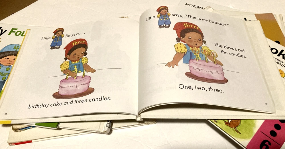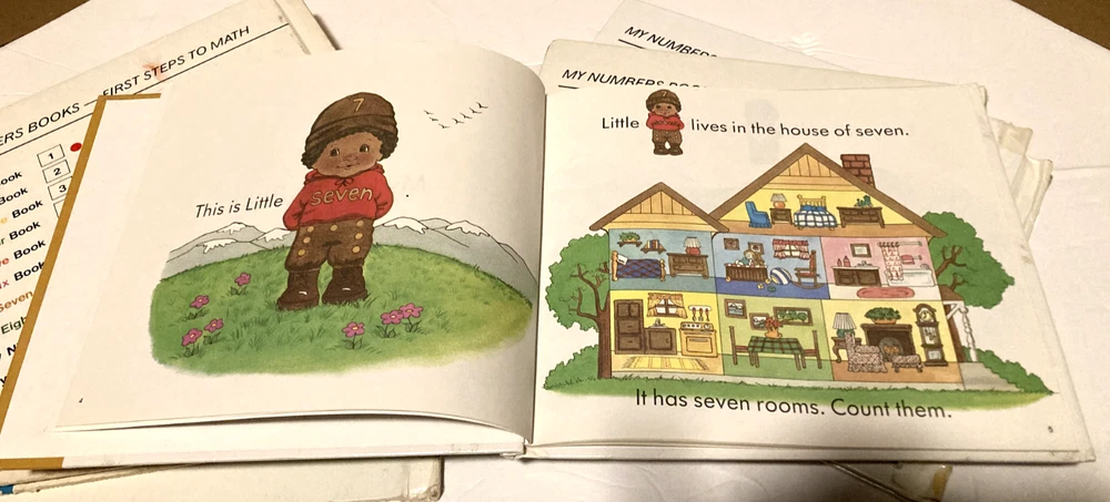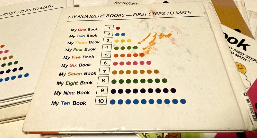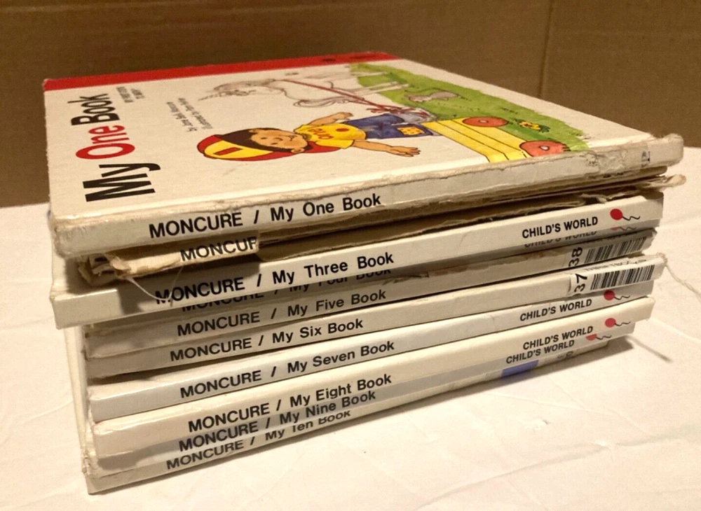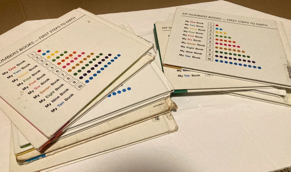 This is the complete series of My First Steps to Math- My One Book to My Ten Book. The books are former library books and are used. There is some writing and some scribbling in some of the books. Some books have stains to the inside cover. The binding is loose on a few of the books. Please see pictures for detailed condition.