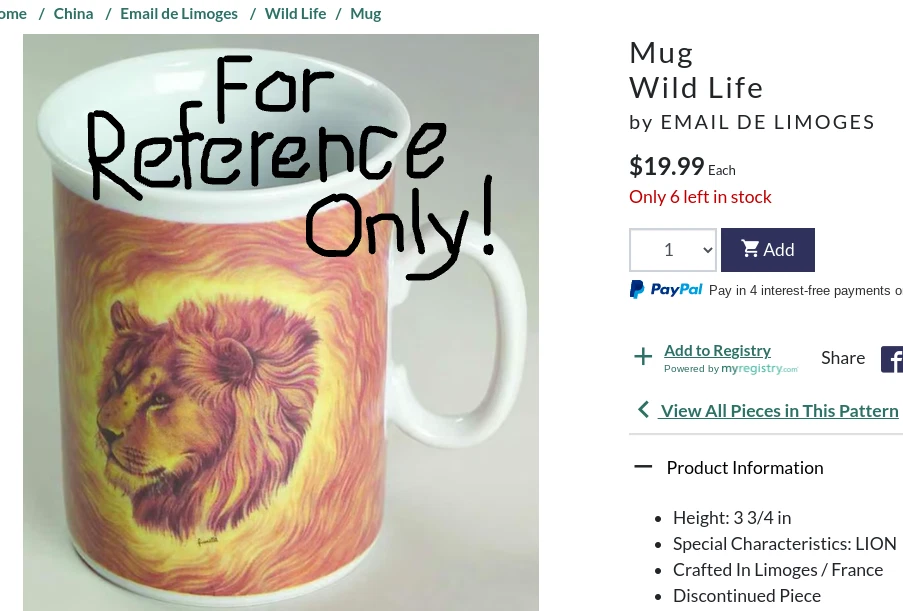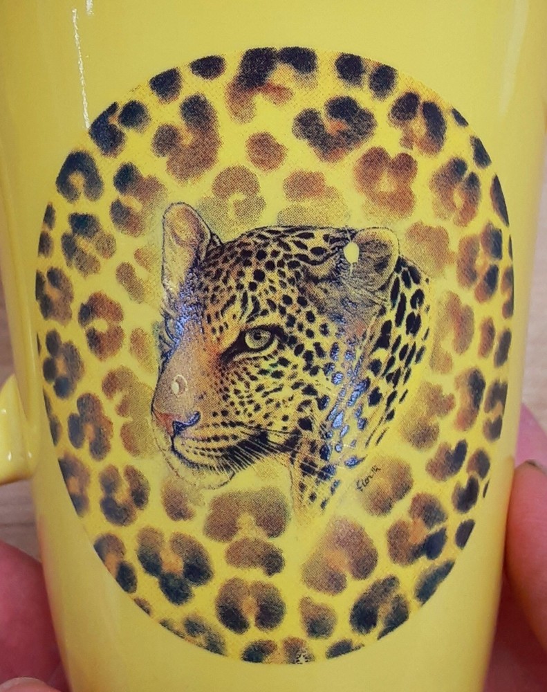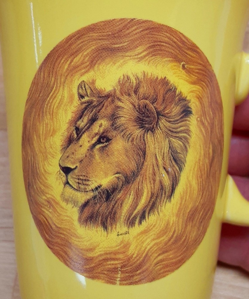 Email de Limoges Lion/Leopard Yellow Mug Signed Fiorilli- RARE Version ========================= Fiorilli LION head portrait on one side. Fiorilli LEOPARD head portrait on other side. Marked "CHINA" on bottom. The last pic is the only reference I could find for the matching Fiorilli artwork. The Limoges product line also has matching salad plates for different animals. Very good gently used condition. There may be minor imperfections in the glaze and portrait printing. See pics.