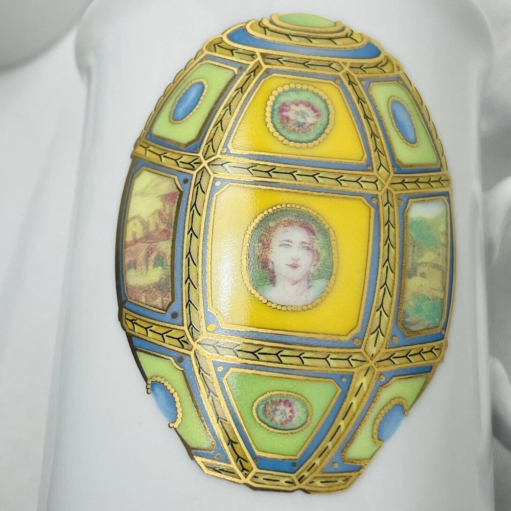 Email de Limoges porcelain coffee tea mugs FABERGE EGG with gold color detail 3 3/4” high x 3” across top Holds 8 ounces comfortably Good vintage condition with no cracks or chips Please see pictures for details
